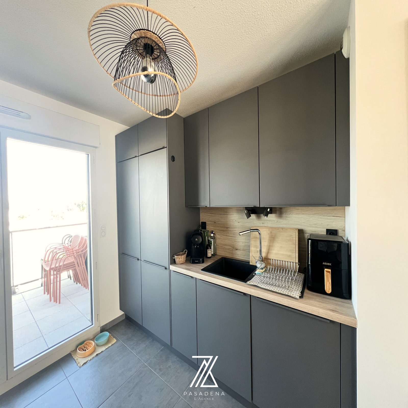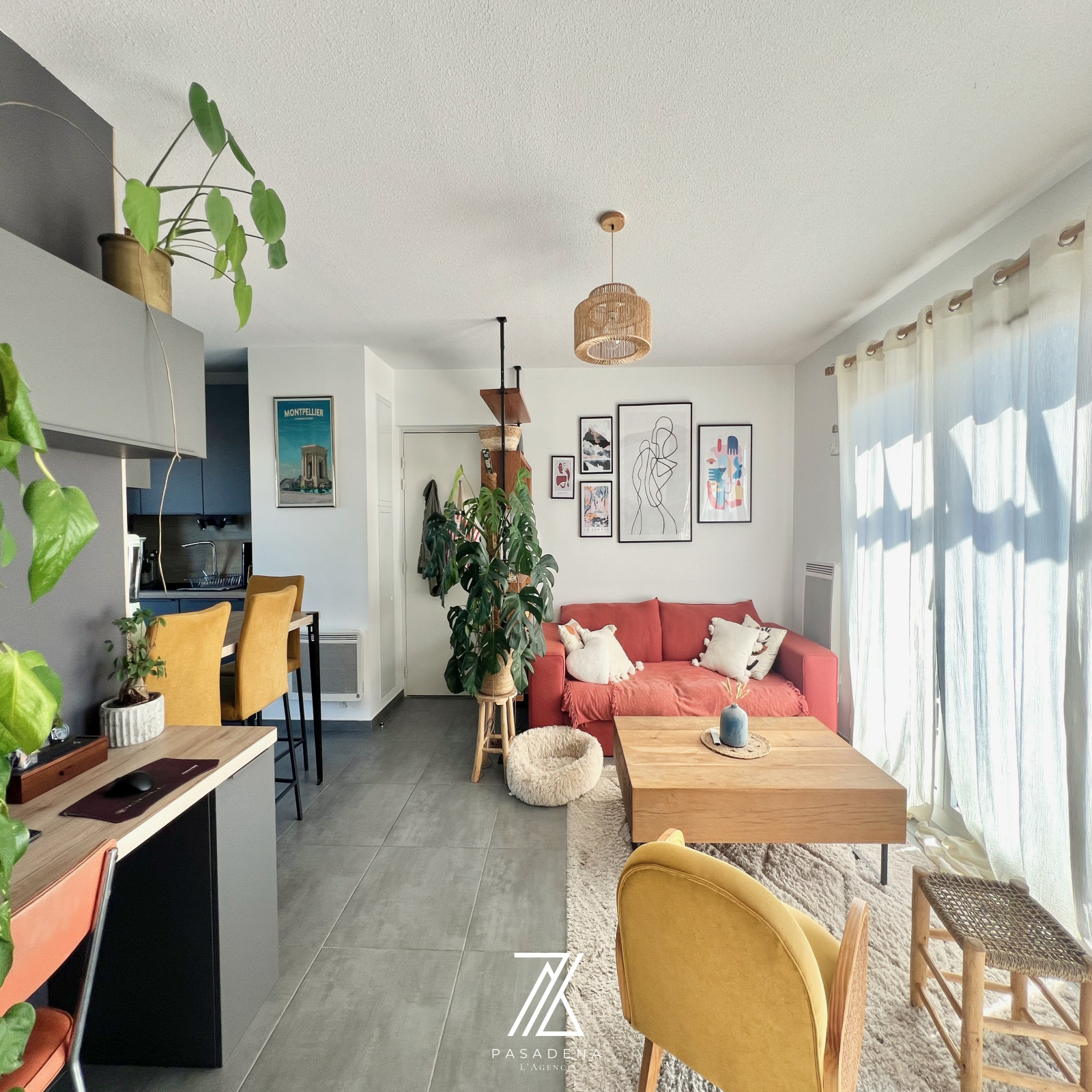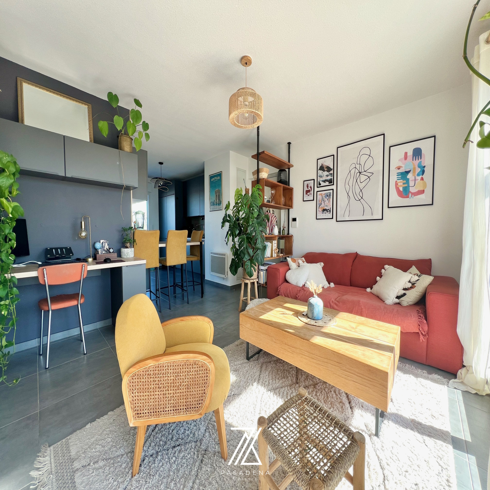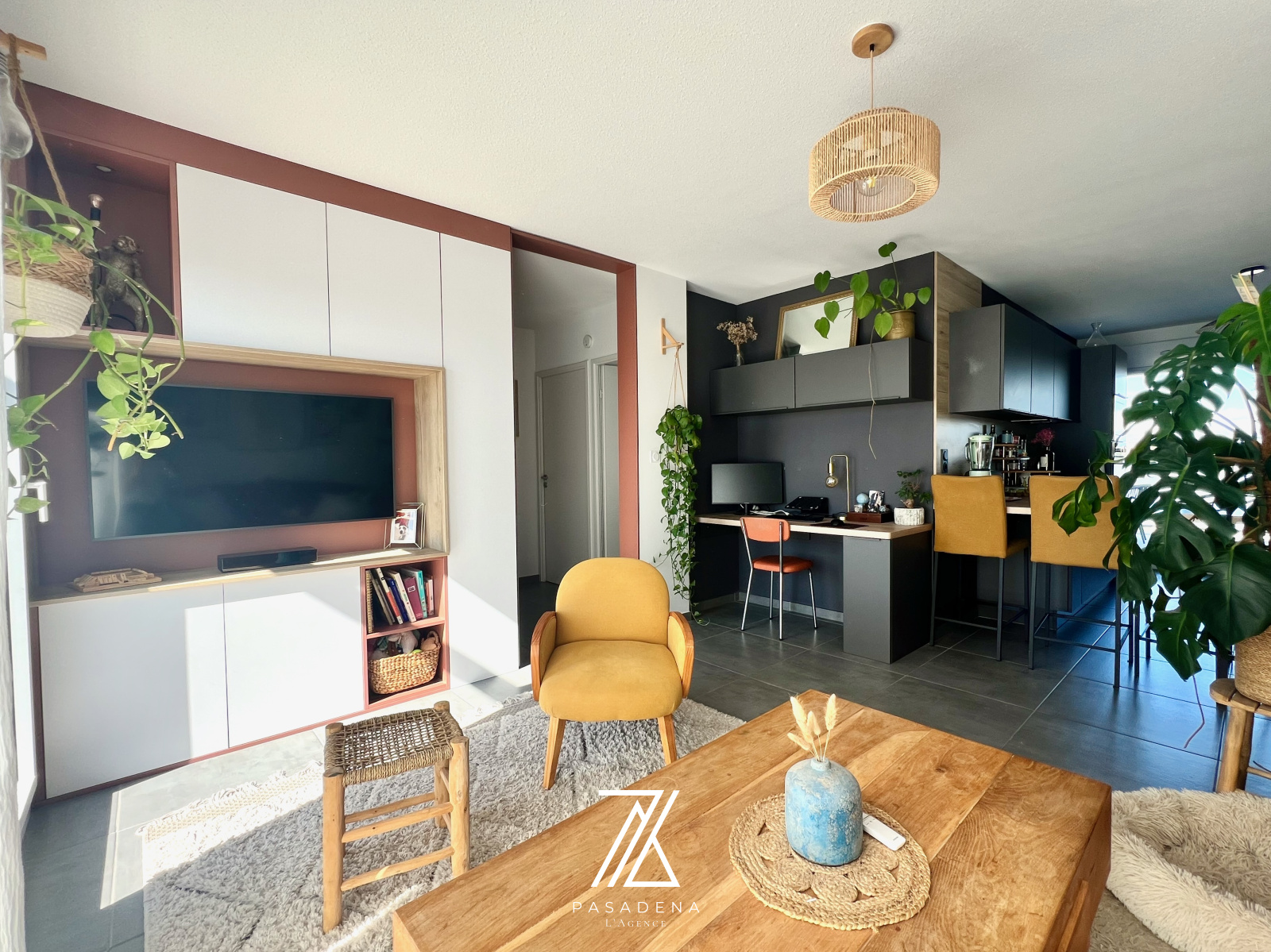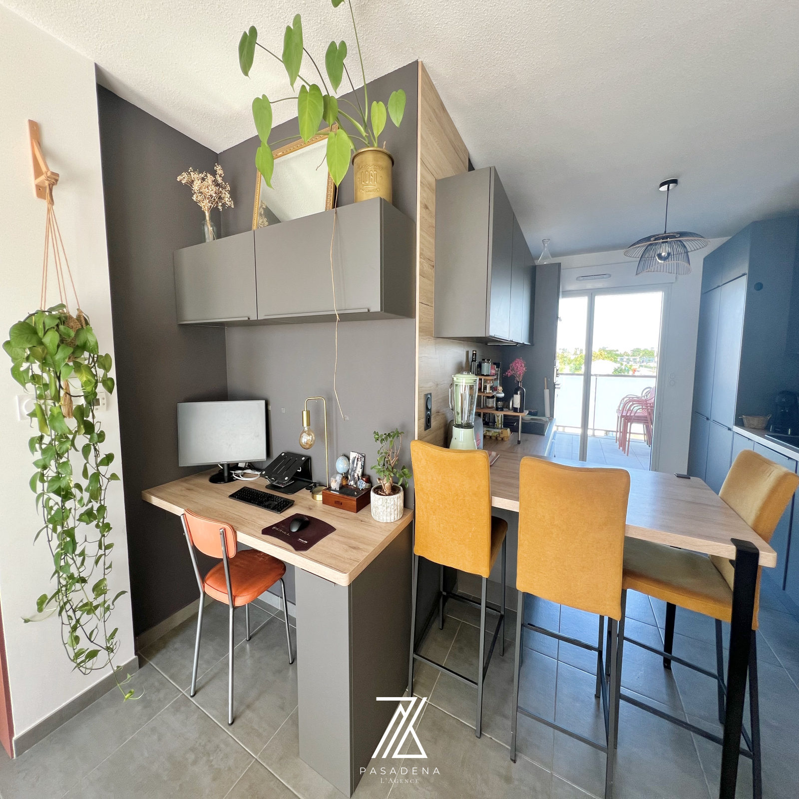 Une pièce de vie de 30 m² avec cuisine sur-mesure toute équipée + espace bureau intégré